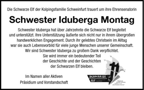 Geboren wurde sie am 27. Juli 1921 als Anna Maria Montag, die Familie stammt aus Gaustadt bei Bamberg. Schon der Vater arbeitete in einer Textilfabrik, sie selbst musste in einer Schneiderei ihre Frau stehen, während er im Krieg war. 1948, nach dem frühen Tod beider Eltern, trat sie den Erlöserschwestern bei, legte hier 1953 die Profess ab. Danach war „Schwester Idu“ in der Lehrwerkstatt des Maria-Theresia-Heims tätig, das sie bis 2004 leitete.